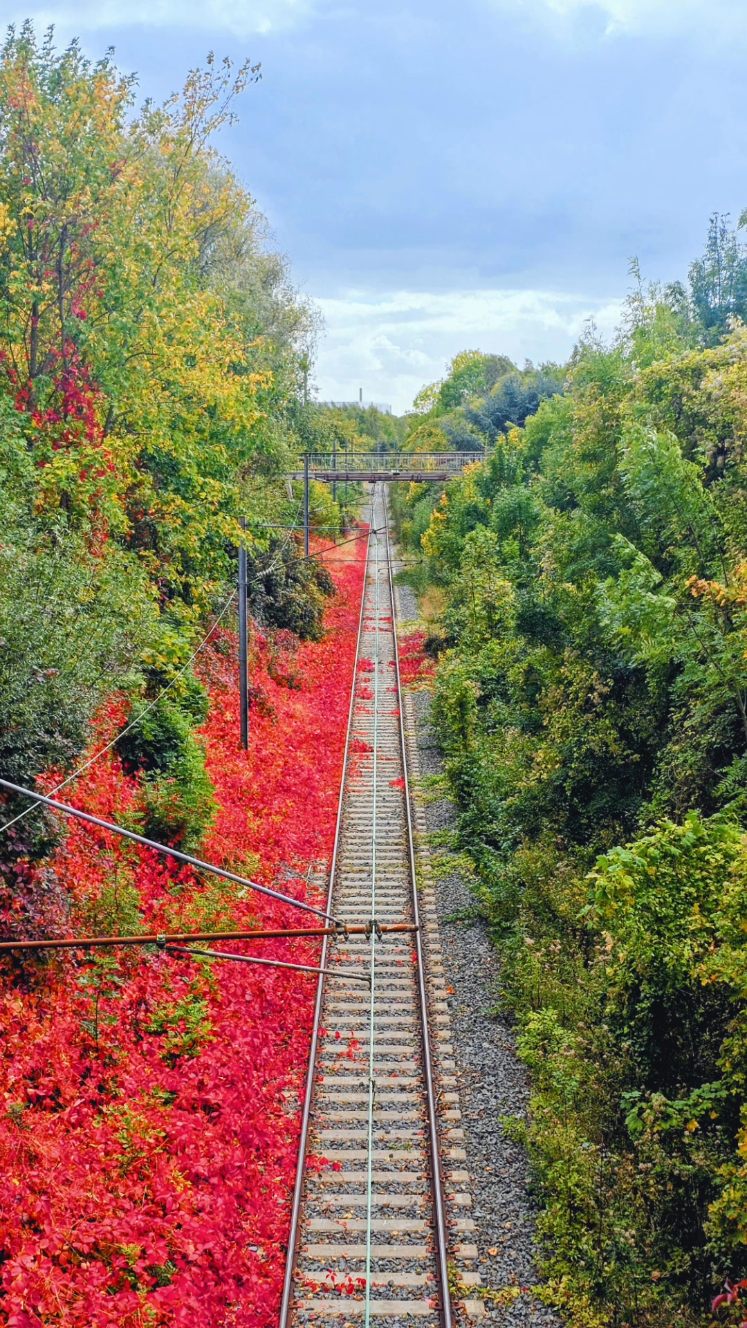En allant à Leroy Merlin en skate, je passe au‑dessus de la voie ferrée. Je vois ce rouge qui envahit le vert. Demi‑tour : photo ! C’est aussi simple que ça, et c’est pour ça qu’on aime l’automne à Lille et dans le coin de Villeneuve‑d’Ascq.