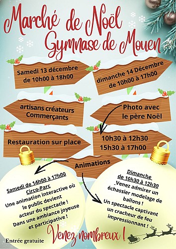 Une vingtaine d'exposants seront présents : artisans et créateurs, food truck, crêpes, gaufres et chocolat chaud. Animations : Circo parc le samedi ; échassier; modelage de ballons et cracheur de feu le dimanche. Photos avec le Père Noël.