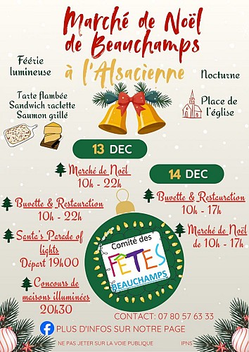 Le Comité des Fêtes de Beauchamps vous invite à son grand marché de Noël à l’ambiance alsacienne ! Artisans, créateurs, producteurs, décor féérique et spécialités gourmandes : tartes flambées, saumon grillé à la flamme, marrons chauds, vin chaud et bière de Noël.