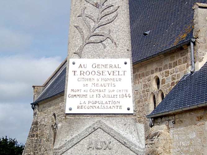 La plaque dédiée au Brigadier Général Théodore Roosevelt JR se situe sur le monument au mort du cimetière, à ces coordonnées : 49.27978563545139, -1.3013329967297096