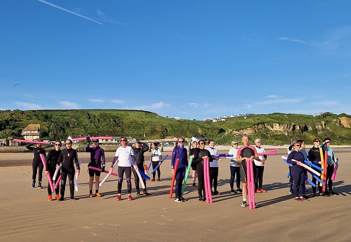 Travail de renforcement musculaire haut et bas du corps dans l'eau, cardio, longe côte, avec matériel (frites, planches,…).