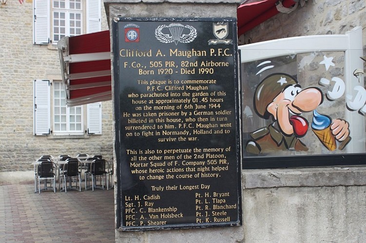 Cette plaque commémore le parachutiste américain Private First Class Clifford A. Maughan (né en 1920 à Yakima dans l’Etat de Washington) de la F Company, 505th Parachute Infantry Regiment, 82nd Airborne Division. Elle est apposée sur un pilier de l’ancienne maison du docteur Monnier, située place de l’église, au 4 rue Eisenhower, à Sainte-Mère-Église, à l’endroit même où le soldat Clifford Maughan atterrit.